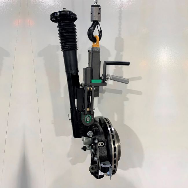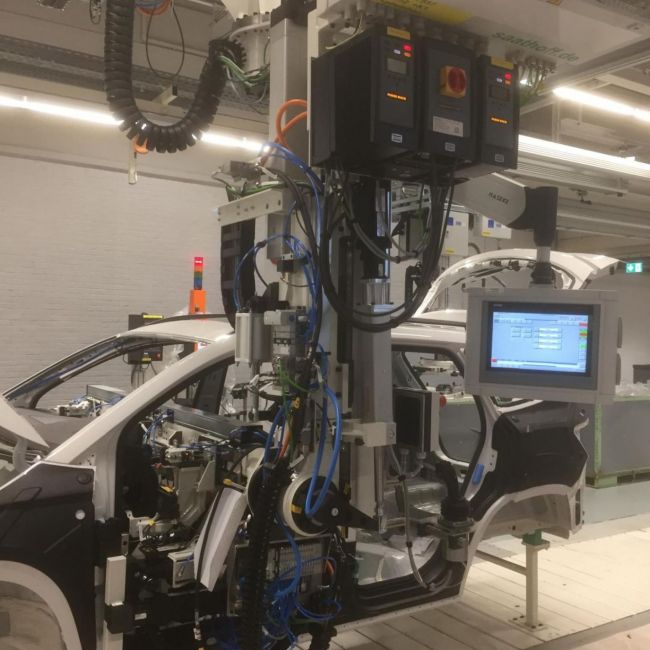 Werkergeführte Einbauvorrichtung zur Abnahme des Cockpits aus dem Werkstückträger und zum passgenauen Einbau in die Karosse.